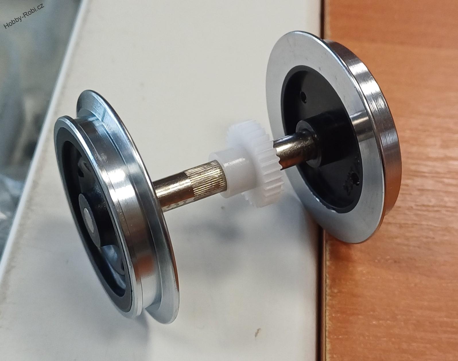 Dvojkolí pro dlouhý dvounápravový nebo třínápravový "C pojezd" LGB s hnacím kolem s rovným ozubením.