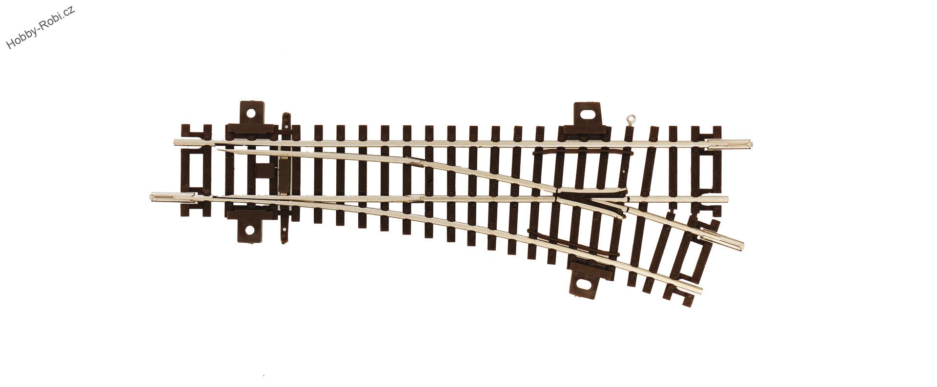 Výhybka s aretací jazyků a napájenou sdcovkou. Poloměr R2 (365 mm), délka 128 mm, 20 st.